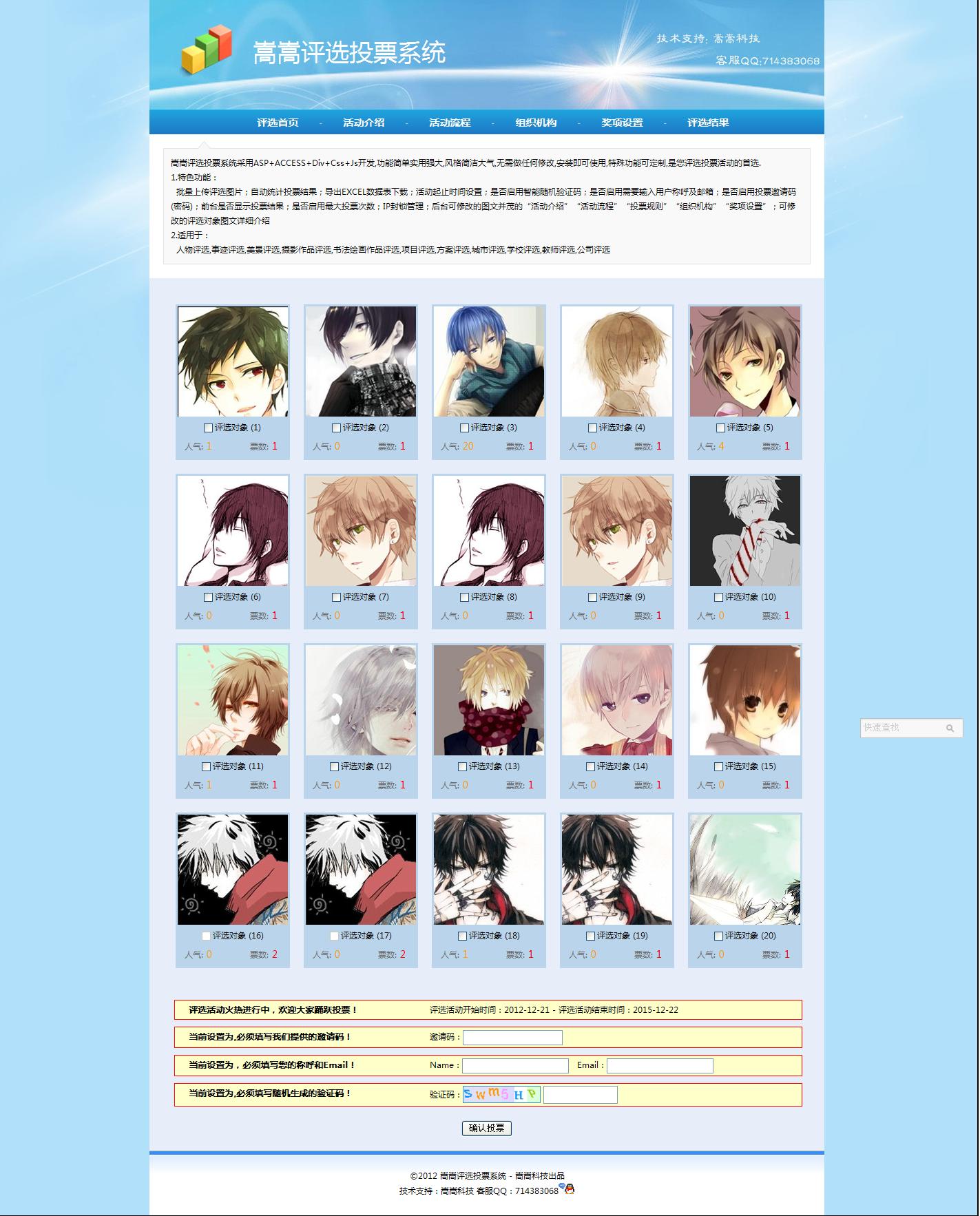 嵩嵩评选投票系统采用ASP+ACCESS+Div+Css+Js开发,功能简单实用强大,风格简洁大气,无需做任何修改,安装即可使用,