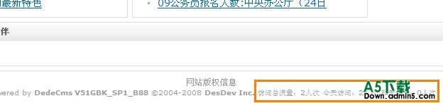 V1增加了在线统计的功能 安装说明: 1.将文件复制到网站目录 2.在模板中加入以下代码 <script type="text/java script" src="{dede:field name='phpurl'/}/stat.php"></script> 3.重新生成html,OK