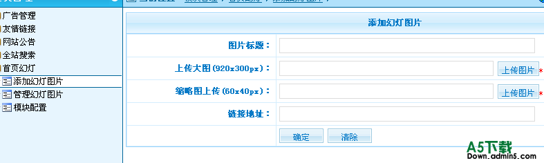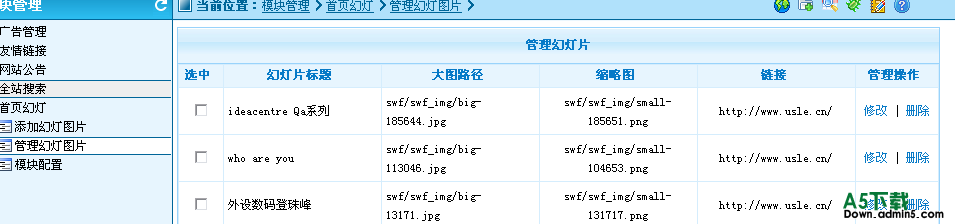 1.本模块为独立模块,PHPCMS系统升级不影响使用。安装卸载简单易用。 2.采用xml存储方便flash调取数据,几乎不影响显示速度。 3.缩略图使用背景图作为半透明填补,显示效果更加精细! 4.使用xml存储图片信息,可以增,删,改图片,标题,链接,大图,缩略图。 注:没有记录在mysql附件记录中。 5.可以设置图片数量,图片大小(宽,高) 6.非常适合企业站使用!