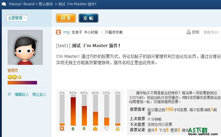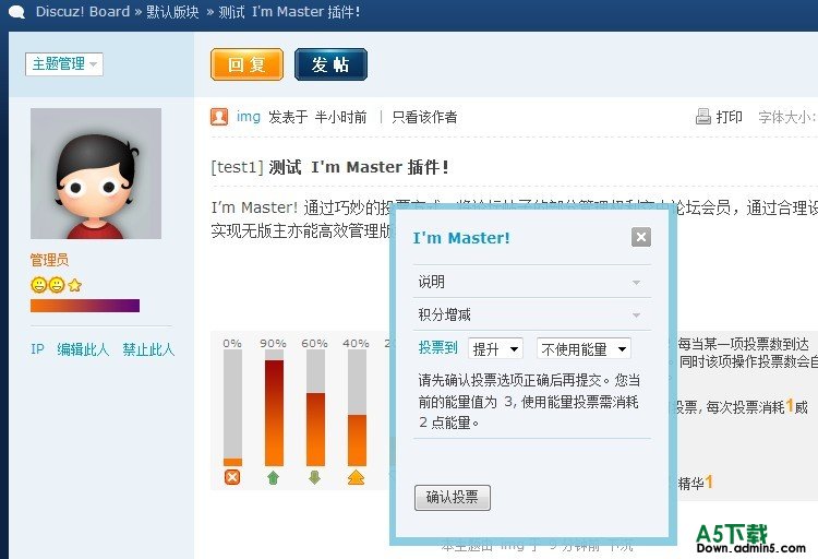I’m Master! 通过巧妙的投票方式,将论坛帖子的部分管理权利交由论坛会员,通过合理设置可实现无版主亦能高效管理版块,插件名称正是由此而来。