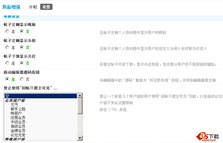插件简介:Discuz! 界面增强,各种小东西。界面元素修改。安装后请到设置里面进行设置。兼容 7.x 版本