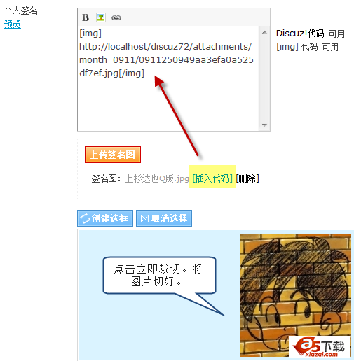 切好的图片,可以点击“插入代码”将图片插入到个人签名中啦~, 如图所示