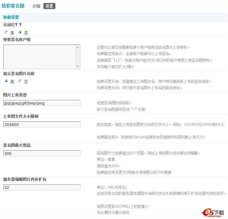 插件简介:为每个论坛用户(或指定用户组)开启上传签名图片的功能,并对用户上传的图片提供裁切功能,上传图片(文件大小与图片尺寸)由管理员后台设定。