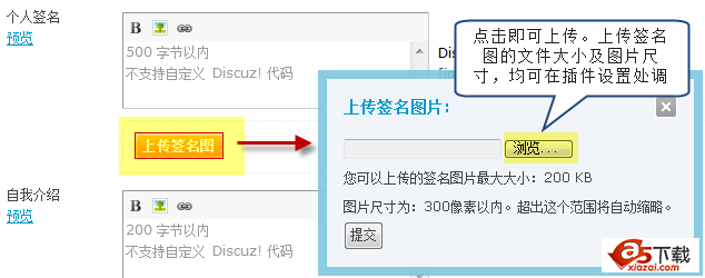 在您的论坛“个人中心”资料编辑页面,会增加一个“上传签名图”按钮: