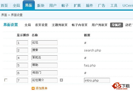 安装方法:请下载压缩文件,里面有两个文件:intro.php和intro.htm,第一个文件放在BBS目录下,第二个文件放在templates/default/下,然后在后台添加导航菜单intro.php,如下图: