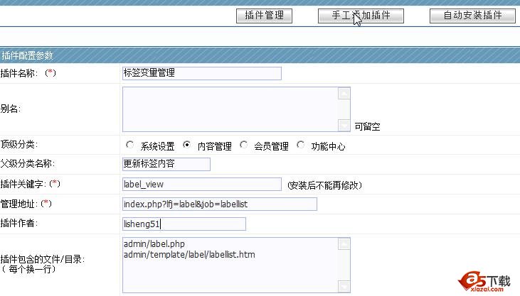 后台-系统设置-功能管理中心-手工添加插件: