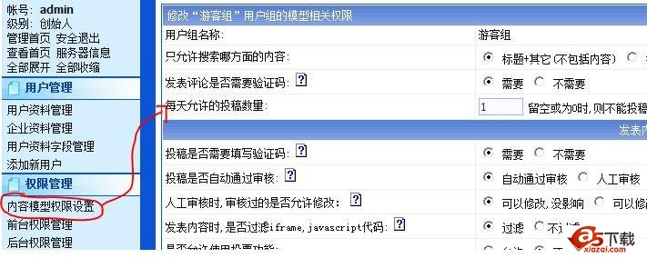 保存后进入后台--会员管理--内容模型权限设置,然后选择会员组的权限设置