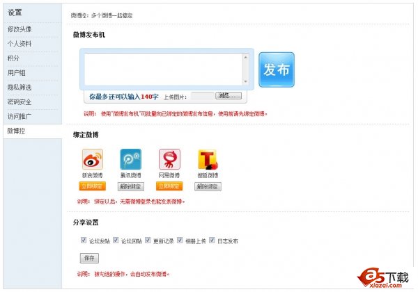 用户可以设置微博与日常操作(论坛发帖,论坛回帖,记录更新,日志发布,相册更新等)进行关联。比如用户设置了关联论坛发帖以后,用户每次发帖,同时也会发布到用户绑定的微博,站外的人可以通过微博 访问到网站。给您网站带来意外的流量。