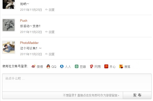 4.与社交网站紧密结合:评论同时能分享到各大社交网站,评论框中能自动显示网页相关新浪微博和腾讯微博