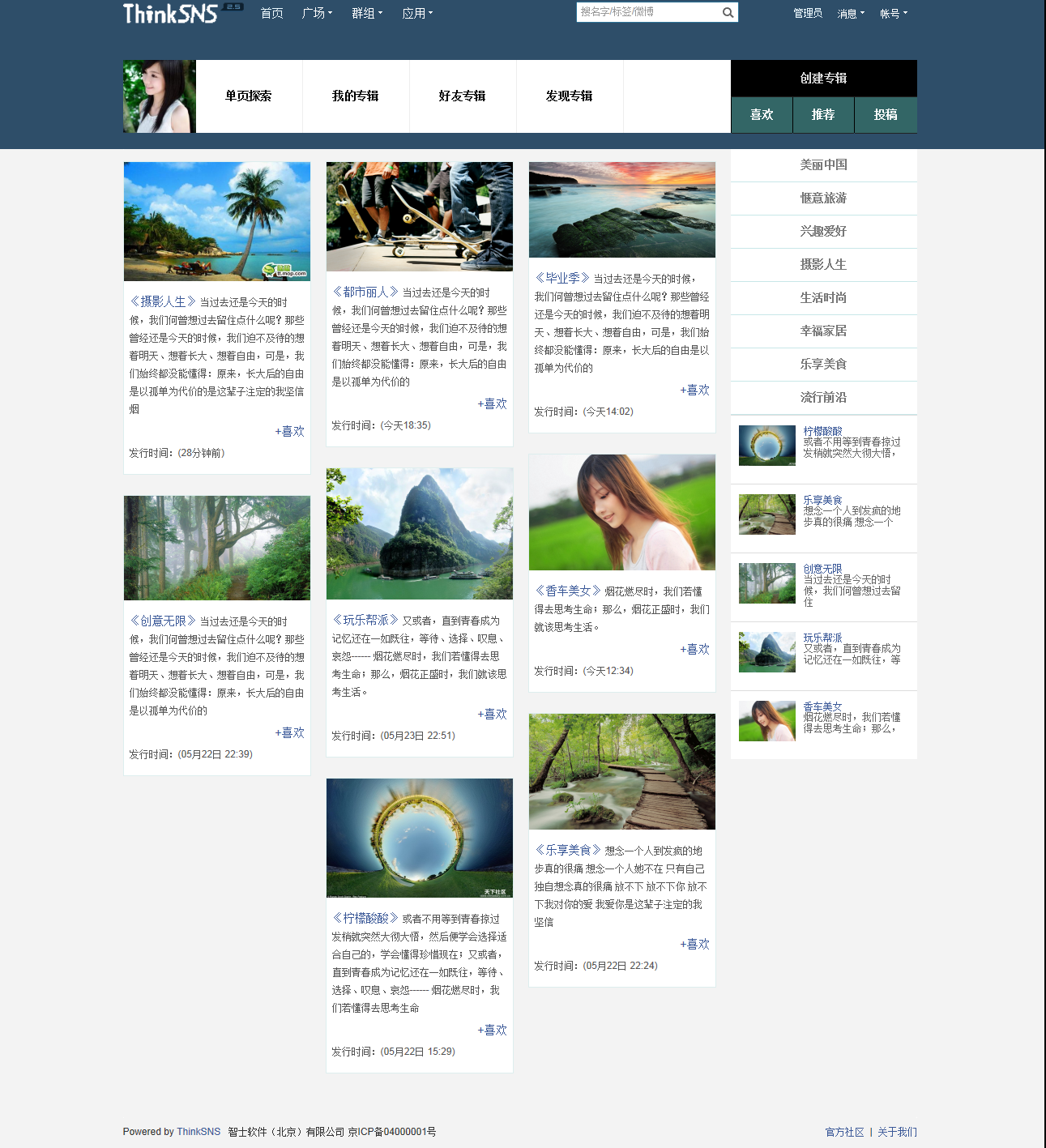 简介 专辑,其实更像一本杂志,有一个封面,翻开杂志里面有不同的主题,点开就是主题的详细、、、。 1、新增后台推荐优秀专辑展示 2、新增喜欢,收藏自己喜欢的专辑和单页 3、修复我的专辑页模板不存在问题 4、修复单页图片不显示问题 5、界面大幅修改(以后不会大幅度修改,不适合自己网站的自己改) 6、改进专辑展示页的头部,使其更友好