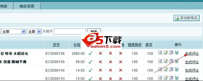 插件安装完成之后,进入后台商品列表界面,会发现每个商品多了一个链接地址“生成评论”,如下图: