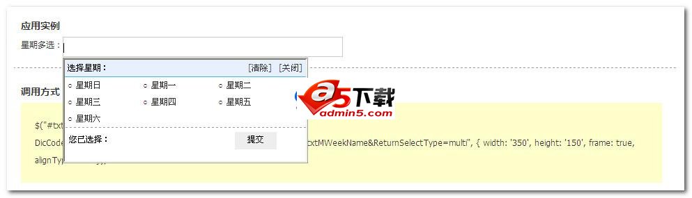 1、使用文件:Jquery.min.js,Jquery.floatdiv.js,floatdiv.css; 2、示例提供Ajax调用静态HTML文件方式,更加适合各种弹出窗口应用; 3、示例提供一级多选模式,用户可以在此基础上配合程序做成二级单选、多选模式。