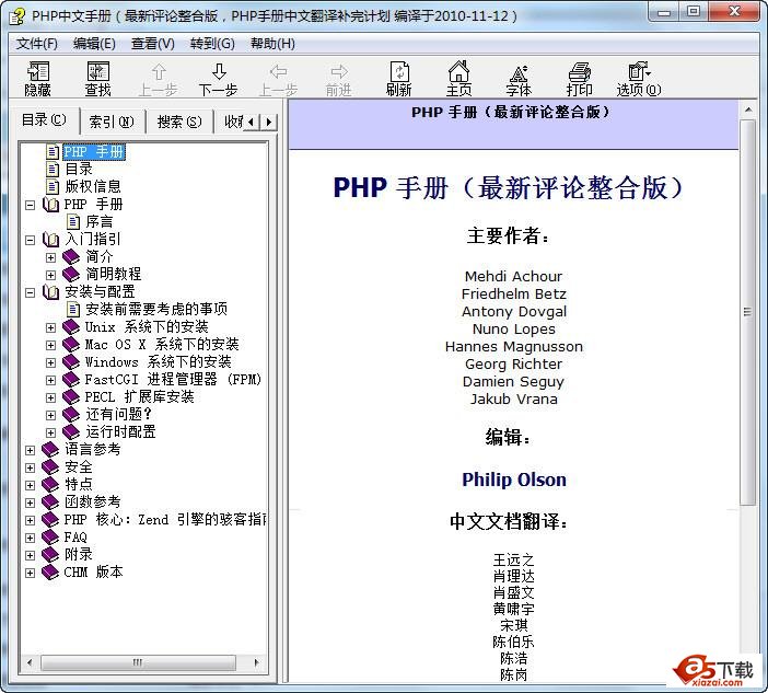 PHP中文手册是针对开发人员的,他们希望每时每刻都有手册在手头,并且不需要等待远程页面下载就可以阅读手册以及用户注解。此版本整合在线评论信息。编译时间: 2010-11-12 功能:Features 1.最新PHP中文/英文手册,每周SVN同步到最新版本 2.整合在线评论信息,蕴含巨大宝藏,学习进阶必备 3.CHM格式,方便随身携带,可与其他软件完美配合使用 4.导航详细,索引完整,搜索方便 5.需求征集,打造最易用PHP中文CHM手册