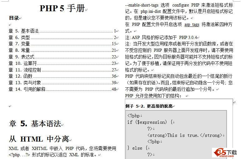 《PHP5中文手册》目录: 章 5. 基本语法 1 章 6. 类型 2 章 7. 变量 15 章 8. 常量 21 章 9. 表达式 22 章 10. 运算符 23 章 11. 流程控制 27 章 12. 函数 36 章 13. 类与对象 39 章 14. 引用的解释 48