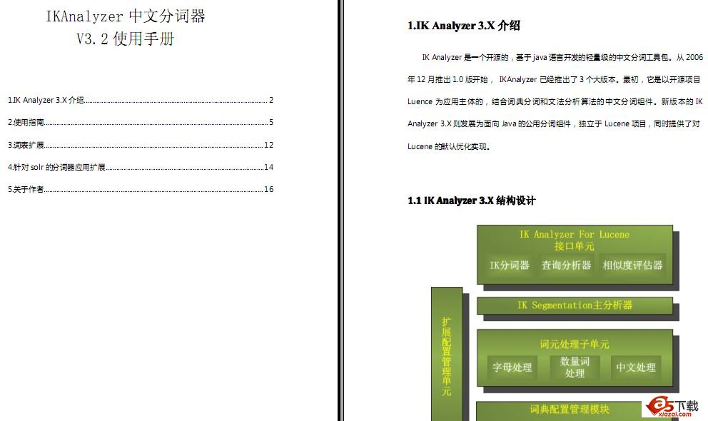 IKAnalyzer是一个开源的,基于java语言开发的轻量级的中文分词工具包。从2006年12月推出1.0版开始,IKAnalyzer已经推出了3个大版本。最初,它是以开源项目Luence为应用主体的,结合词典分词和文法分析算法的中文分词组件。新版本的IKAnalyzer3.0则发展为面向Java的公用分词组件,独立于Lucene项目,同时提供了对Lucene的默认优化实现。