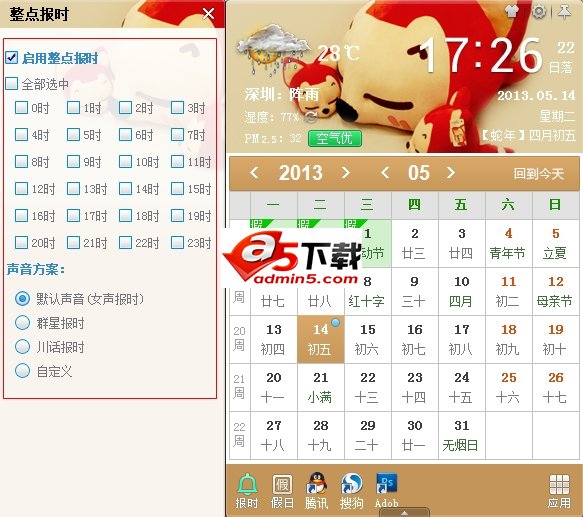 美女播音整点报时?对,你没听错,哪天你突然听见美女整点为您报时,绝对不是幻听;人生日历整点报时功能,采用美女主播声音报时,够吸引你了吧?另外还有群星报时、川话报时等各种版本。假如说,你想自定义。没问题,绝对满足您自定义整点报时声音的要求,只需勾选自定义,便可自主上传报时铃声。这下你还担心报时声音不喜欢吗?