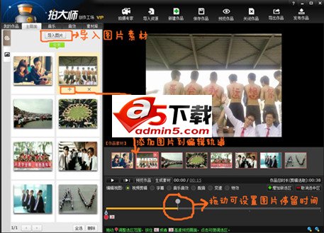 第2步:【素材导入】如下图2,导入图片素材,将图片添加到编辑轨道,设置图片停留时间。