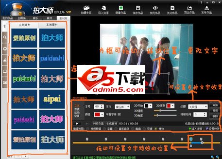 置字号、字体、颜色、时间、滤镜、运 动、背景等各种效果。