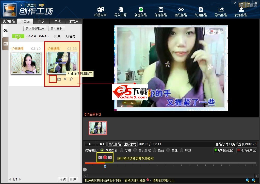 step4:导入素材或者拍摄好素材之后我们就可以对视频素材进行编辑处理。将视频素材从素材主画面拖动到右边的编辑区域,即可对改素材进行编辑处理。也可以点击主画面里的视频缩略图下面的[+]添加编辑。添加之后在时间轴上进行拖动,选取播放时间区域。