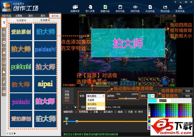 第2步:如下图1,点击【素材库】的文字【T】图标,选择添加喜欢的文字特效。在特效编辑区域点击【背景】,选择【填充颜色】,拖动中间的百分比图标调整背景颜色的透明度,点击【颜色】右边的黑色三角形符号可选择不同的背景色,拉动文字四周的背景色框可调整大小。