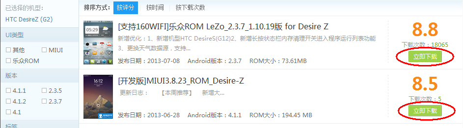 到ROM市场找到你手机型号的ROM,以Desire Z为例,选择自己想要刷入的ROM包之后,点击下载即可。