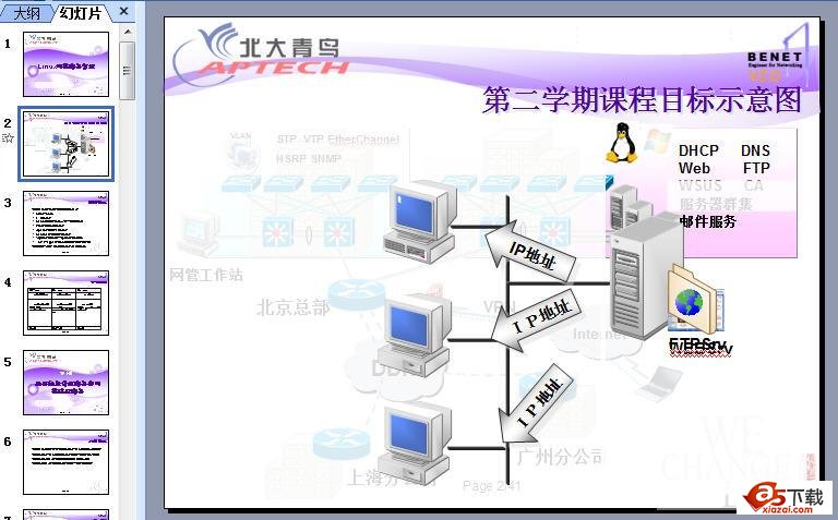 《北大青鸟Linux服务器搭建课程2.0》课程目标: 使用Linux主机作为网络服务器 DHCP与NIS FTP服务器 Samba实现Windows文件共享服务 BIND作为DNS服务器 Apache作为Web服务器 Sendmail作为邮件服务器 squid代理服务器与iptables防火墙 TCP Wrappers和SSH实现系统安全管理 使用客户机对Linux服务器进行测试