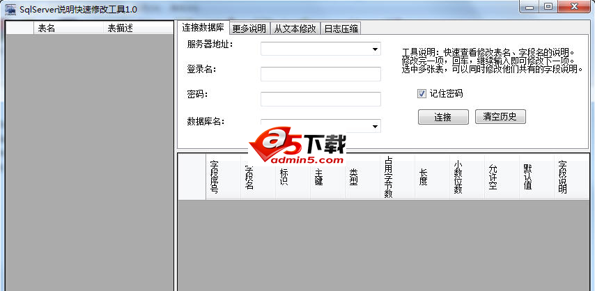SqlServerQuickText说明快速修改工具是个在说明修改方面功能比较全面、实用的小软件。可以快速为多张表的相同字段设置说明,表设置了多个说明时,可以删除多余的说明。可以从文本分析为字段加说明。查看各数据库日志大小,压缩指定日志。