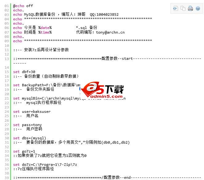 mysql备份脚本,mysql做好以后做个计划任务用管理员权限运行就中了。另外如果想节省空间就装个 7zip 软件, 注意bat 必备哦!如何使用,请查看代码。