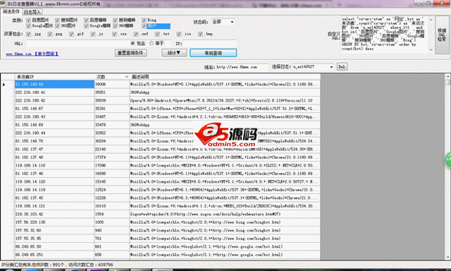 iis日志查看可以帮助站长获得很多有用的消息,来更好的进行网站的运营工作,因此IIS日志查看器是一种非常实用的站长工具软件,A5源码站为您推荐这款绿色软件,免安装,功能强大,本工具使用本地SQLite微型数据库,支持IIS6、IIS7大日志分析处理,速度极快, 体积小巧,无广告。