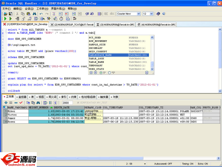 (3) 超智能的SQL编辑器,具有代码跟踪提示功能,弹出提示窗口列出关键字、关键字组合、函数名、列名、对象名、对象类型等,极大地提高SQL编辑效率;