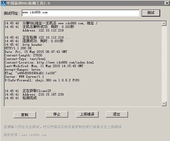 网址检测器作为站长是需要经常检查网站是否正常,本软件可以测试出网站是否正常,网站页面大小,以及本地IP的检测。软件可以实现检测HTTP状态,Content-Length页面大小,是否有启用gzip页面压缩功能,Content-Location网站首页检测,Address本地IP!