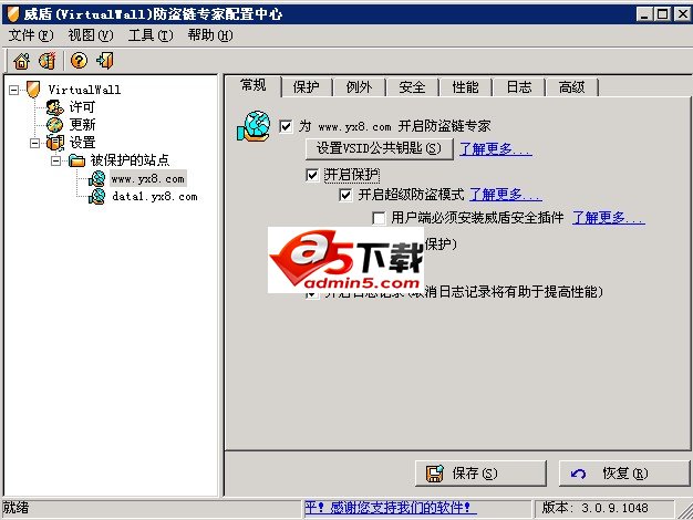 “威盾(VirtualWall)防盗链专家”是一款基于微软 IIS 服务器编写的一款优秀的防盗链软件。 软件主要功能: 超强防盗链 下载线程限制 保护任何类型文件不被盗链,拦截任何暴力下载工具的 Referer 伪造盗链。彻底防迅雷、FlashGet 等。 可以限制任何类型文件的下载线程数,防暴力下载,有效保护服务器稳定运行。 下载速度限制 最大连接数和带宽限制 可以限制任何类型文件的下载速度,防暴力下载,有效保护服务器稳定运行。 可以自由限制每个网站的最大并发连接数和每个网站的最大使用带宽。 防SQL注入 防下载(视频、音乐) 全面 URL 安全检查,彻底防止 SQL 注入攻击;彻底防止大文件上传攻击。 针对在线视频、音乐,可以设置强制在网页上播放,不允许任何下载工具下载。 防嗅探 保护Access数据库 可以配置伪装 IIS 服务器为其他类型的服务器,从而有防止嗅探工具的嗅探,保护服务器安全。 通过设置 .mdb 类型文件“拒绝所有HTTP请求”,任何人都无法下载到 Access 数据库文件。 防采集 附带功能 可以限制单个 IP 单日最大访问量,从而有效阻止采集程序的访问,但不会影响正常用户访问。 附带简单易用的 CPU、内存、网络流量检测器,轻松观察服务器运行情况。