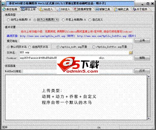 动网论坛上传漏洞功能、动力系统上传漏洞功能、乔客上传漏洞功能以及自定义上传功能!程序中默认防杀asp木马一个,也可自选!