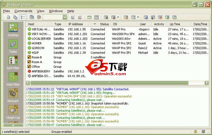 安装方面,Desktop Orbiter 采取主从式架构,安装主要分成两个不同的组件:操控程序“ SETUP.EXE ”安装在网络管理者的计算机中,另外,其它所有的计算机都安装卫星服务程序“SATINST.EXE”。