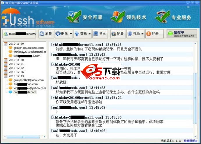 同时监控:腾讯QQ和TM、微软MSN、移动飞信(Fetion)、雅虎通(Yahoo!Messager)等几大主流聊天软件,并且将聊天内容保存到自己的消息库中,供管理人员浏览查看;也可以把这些聊天内容即时发送到指定的电子邮箱中,实现远程监控。既可以对自己想要监控的人实施监控,同时也是一款很好的家长管理孩子的软件,主要可以用于监管孩童的电脑,及时掌握孩子上网情况,防止不良交友,确保孩子的有益上网。