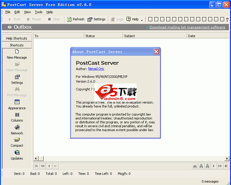 PostCast Server 是一个免费的SMTP服务器软件,能让你直接从你的电脑寄信。这个软件是使用在寄发电子报,发布不同信件给不同邮件群组,寄发确认信给你的顾客,还有寄发个人信件之用。你现在就可以直接舍弃掉你的ISP给你的邮件服务器,它支持所有邮件软件,一但这个软件已经设定完毕,它可在后台执行它,你可以设定程序在某特定时间发信,如需要的话,这软件可自动上网,在完成工作之后自动终止下线。你可以在连接LAN网络电脑上直接使用。