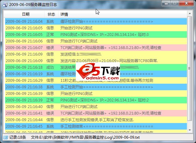 ServerM是一个免费的服务器监控程序,有TCP端口检测和Ping检测,一旦检测失败,可以向设置的手机号码或邮箱发送告警短信或邮件
