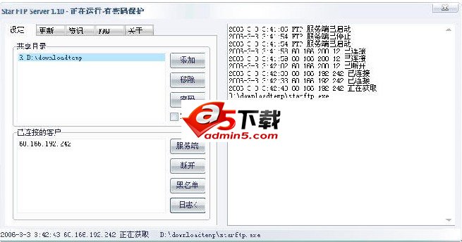 支持多目录共享,支持读、写权限设置和密码保护,支持自设端口和客户端连接数,支持被动模式和代理,支持黑名单,日志部分也相对完善,可详细显示每个客户在您机器上所进行的操作,具体到正在上传、下载某个文件。