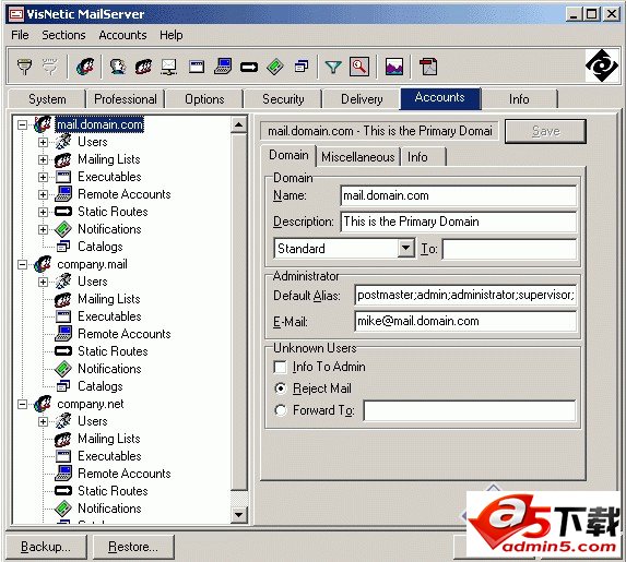 是一种新型支持高速内存模式和SSL/TLS连接的、目前最快最安全的邮件服务器和邮件管理系统。是一种多进程、多处理器的邮件服务器,其特点:最大限度的支持邮件协议,包括:SMTP、POP3、IMAP4、LDAP、ACL;每一种协议都能使用安全利用SSL/TLS;支持Web Mail;支持无限多个域、无限多个帐号;支持开放式数据库(ODBC);支持VisNetic AntiVirus Plug-in最大限度的过滤邮件病毒;系统管理员能快速、安全、稳定的查找邮件信息…