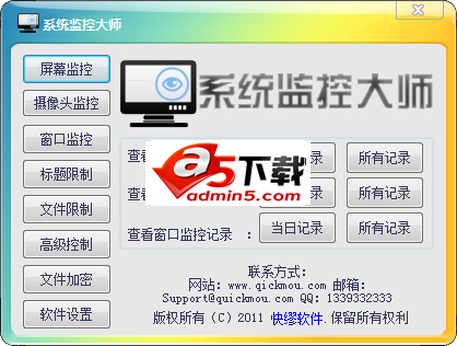 想知道TA或您的子女在网上做了些什么吗?系统监控大师可以按照您的设置把被监控电脑的屏幕图像和摄像头图像定时记录下载,并保存为图片;并可以记录下系统打开的窗口的标题,到保存为文本;系统监控大师支持把监控到的文件(屏幕截图,摄像头截图和记录打开窗口的标题)发送到指定的邮箱,让您轻松实现网络实时监控。系统监控大师还可以禁止打开指定的窗口或程序,例如,您可以禁止运行下载软件和聊天软件,则这些软件将不能运行。您也可以设置自动关闭含有不良词语标题的窗口。系统监控大师提供了如文件加密,定时关机等诸多附加功能。本软件可以在被监控电脑的用户毫无察觉中记录电脑的一举一动。系统监控大师,您电脑7×24小时的一双眼。