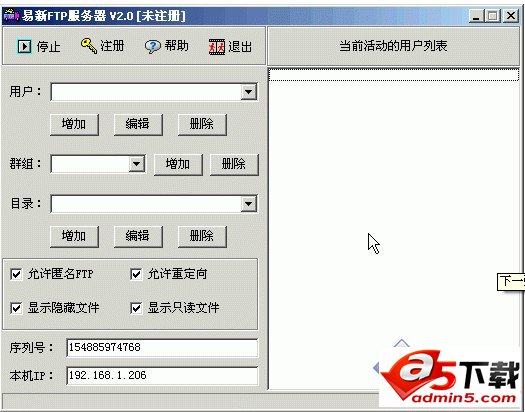 只要连上互联网,获得独立的IP地址,可以把你的普通PC机作为一台ftp服务器,向全世界开通FTP自主文件上传和下载服务。你可为每个用户分配不同文件目录,为防止用户知道其在本机的真实目录,请设置虚拟目录,如虚拟目录为空则系统设置其虚拟目录为根目录。如果你的IP是固定的,则可以让域名指向到你的IP地址如ftp.xxxx.com,如果你的IP是动态的,你也可以用动态域名转向到你的动态IP上。如果没有域名可以转向,你也可以告诉别人输入你的IP地址使用IE或CuteFTP等类似的程序进行文件上传、下载等操作。