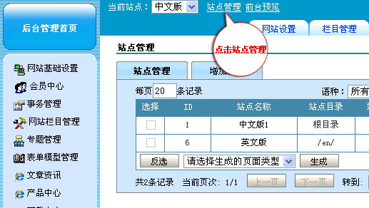 站点管理左下角有一个批量生成静态的功能,如果你站点开启了静态,可以在这里来统一生成所有的静态文件(如栏目页、子栏目页、文章页面、产品页面等)。