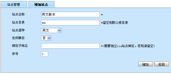 绑定子域名:不开启子域名请不要填写,如果你需要用en.yourdomain.cn类似子域名,那么你在iis中必须新建一个站点,这个站点需绑定域名en.yourdomain.cn,并且把pageadmin文件复制一份到对应站点目录下。