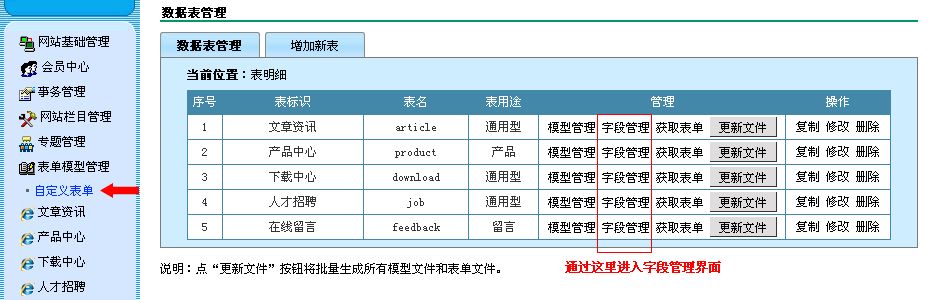 注:当增加完所有字段后,务必返回字段管理界面点击一下”更新“按钮(或表单管理界面点击“更新文件”按钮)来重新生成一下新的表单文件,否则会导致后台和会员中心发布表单中没有新增加的字段。