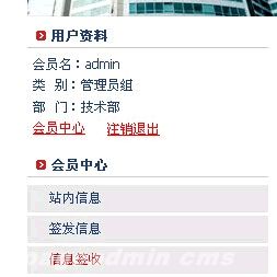 然后登陆前台会员中心,这里以admin为例,登陆后点击会员左侧的信息签收菜单即可看到需要签收的信息,如下图: