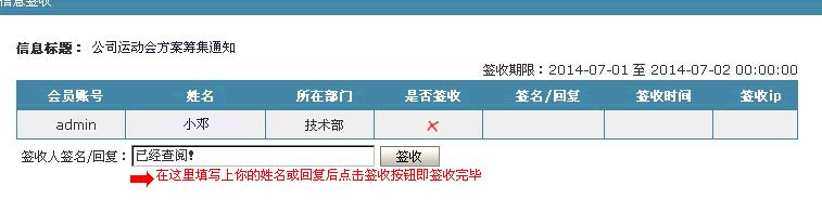2、发布后,签收用户如果是管理员也可以在后台事物管理>>信息签收处签收,如下图: