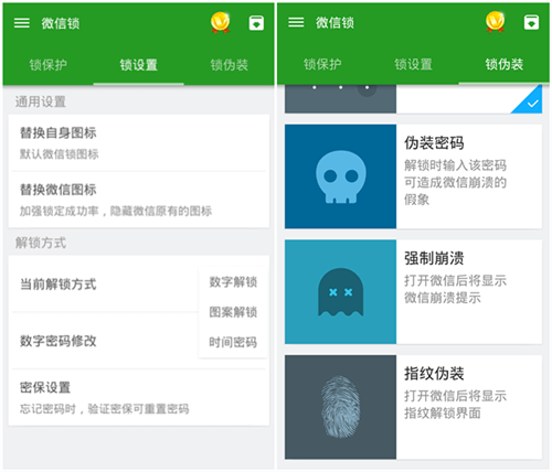 城里人玩的就是范儿。微信锁不仅是满足他们给微信上锁,保护隐私的需求,还打造了多像神秘功能,让他们继续主宰他们的时尚,比如:解锁方面,除了提供常用的图形及数字解锁,还为担心忘记密码的朋友设计了时间密码,随时间变动;为了化解尴尬,还提供了比较有特色的伪装密码、强制崩溃、指纹伪装等,当然,其中的妙处要你体验后才能知晓;另外,还有一个特色就是自我保护功能,通过设置可以防止被卸载及防止被强制停止。