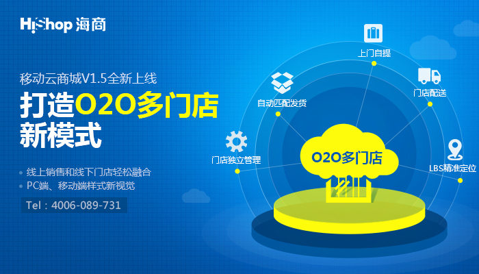 2015年8月6日,国内领先的电子商务服务提供商HiShop旗下的移动云商城V1.5正式上线。据悉,此次升级的最大亮点——O2O多门店功能,是基于电商行业O2O模式盛行的现状而打造的,旨在帮助商家融合线上销售与线下门店,把线上顾客引导至线下取货,把进店顾客导流至线上消费,实现O2O的闭环。