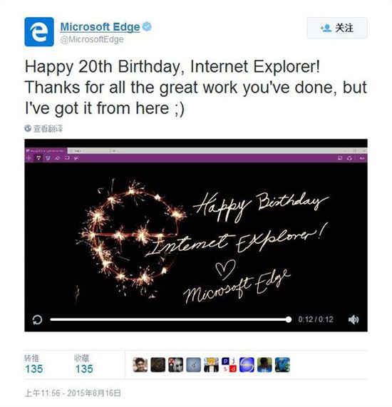 美国当地时间16日中午,Microsoft Edge官微发表了祝词:Internet Explorer 20岁生日快乐!你在过去做出了巨大贡献,今后由我继续发扬光大。