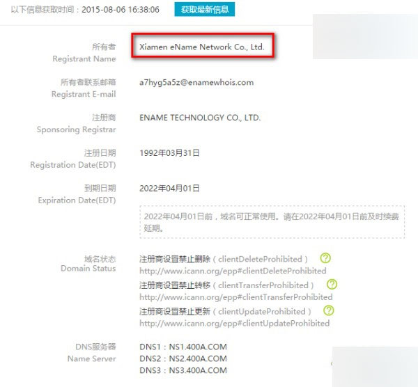 域名信息查询数据显示,域名WE.com的状态为注册商设置客户禁止转移,而且we.com域名所有者处目前显示为“Xiamen eName Network”,也就是域名交易门户网站“易名中国”。